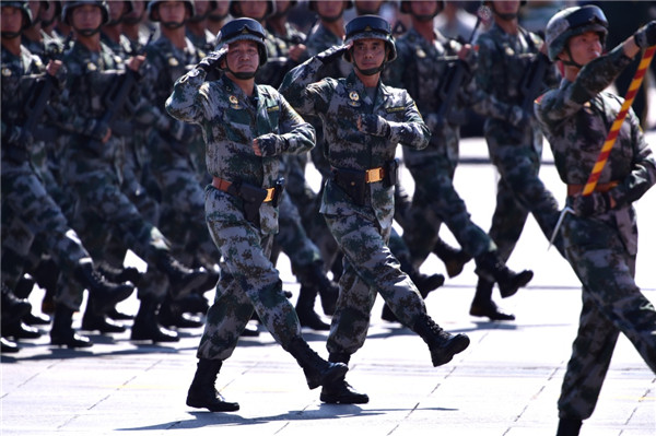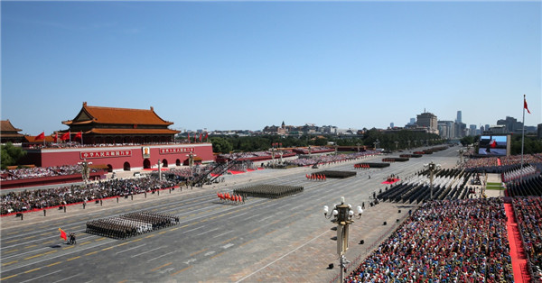 ????2015年9月3日,中國人民抗日戰(zhàn)爭暨世界反法西斯戰(zhàn)爭勝利70周年紀念大會在北京隆重舉行。這是徒步方隊通過天安門廣場。新華社記者 龐興雷 攝
