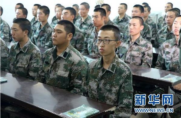 ????資料圖片: 2017年10月2日,在駐守在遼東半島的第79集團軍某旅新兵營,蔚晨陽(前右一)在認真聽課。新華社發(fā)(王立軍 攝)