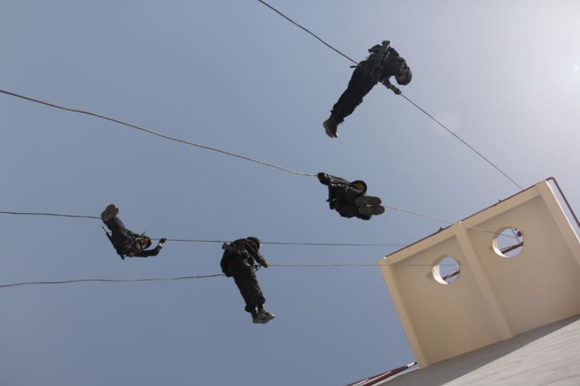 ????資料圖片:武警新疆總隊四支隊特勤中隊進行樓房索降訓(xùn)練。新華社發(fā)(楊皓 攝)