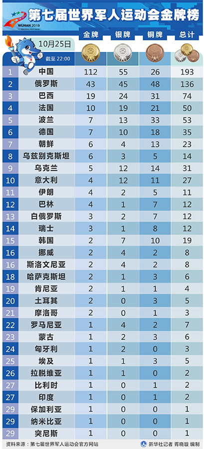 新華社武漢10月25日電(記者王恒志 梁建強(qiáng))112金!中國(guó)軍團(tuán)25日在武漢舉行的第七屆軍運(yùn)會(huì)上實(shí)現(xiàn)了金牌破百、獎(jiǎng)牌近兩百的優(yōu)異戰(zhàn)績(jī)。當(dāng)日中國(guó)軍團(tuán)在田徑、跳水、體操、射擊、海軍五項(xiàng)、拳擊等多個(gè)項(xiàng)目上迎來爆發(fā),單日收獲24金。