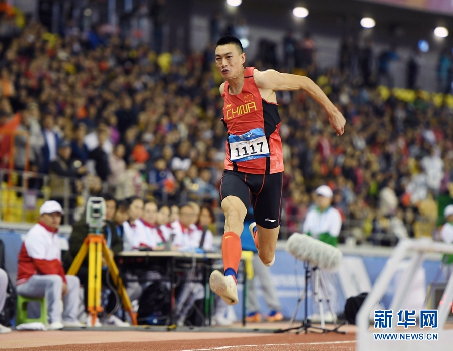 10月26日,中國選手朱亞明在比賽中。當(dāng)日,在武漢舉行的第七屆世界軍人運動會田徑項目男子三級跳遠決賽中,中國選手朱亞明以17米09的成績獲得冠軍。新華社記者 范培珅 攝