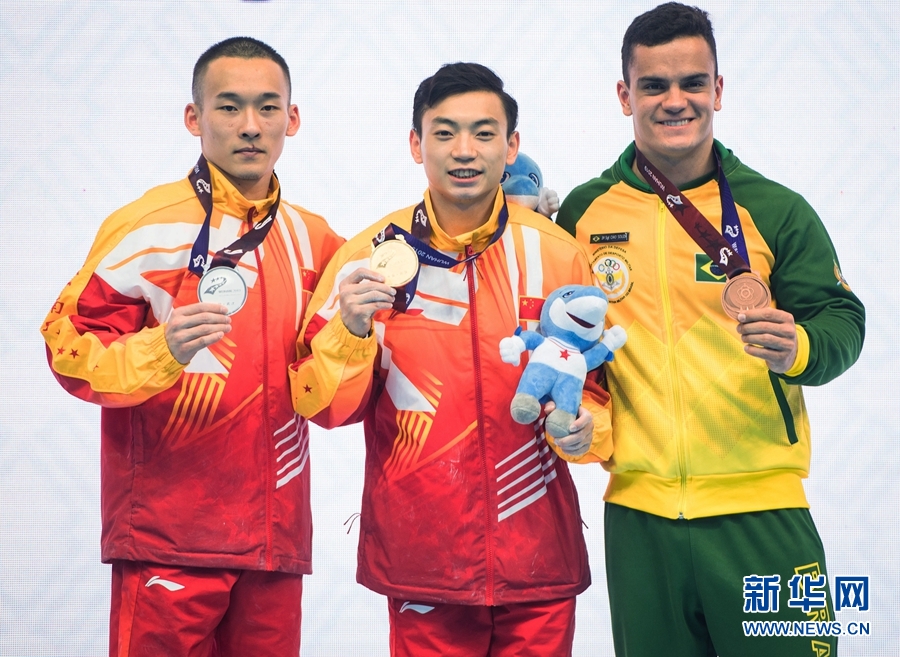 10月26日,冠軍中國選手鄒敬園(中)、亞軍中國選手肖若騰(左)和季軍巴西選手索薩在頒獎儀式上。當(dāng)日,在武漢進行的第七屆世界軍人運動會體操項目雙杠決賽中,中國選手鄒敬園以15.866分的成績獲得冠軍,中國選手肖若騰以14.833分的成績獲得亞軍。新華社記者 肖藝九 攝