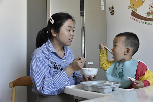 鄭如在給小兒子喂飯。