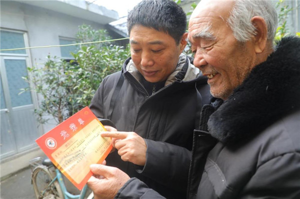 ????費(fèi)縣胡陽鎮(zhèn)退役軍人服務(wù)站站長張中方為優(yōu)撫對象送光榮單。李永臣 攝