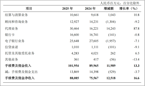农业银行在年报中指出,截至2025年年末,该行实现手续费及佣金净收入880.85 亿元,较上年增加125.18亿元,增长16.6%。其中,代理业务增长87.8%,主要是由于深入推进财富管理业务转型,理财和代销基金收入增加。
