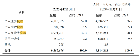 具体来看,个人消费类贷款(含信用卡透支)较上年末增加 1196.43亿元,增长9.0%;个人经营类贷款较上年末增加4969.38亿元,增长19.9%,个人信贷业务结构进一步优化,服务实体经济成效显著,同时为个人贷款余额稳步提升提供了有力支撑。