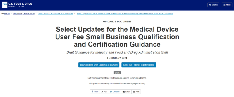 近日,F(xiàn)DA發(fā)布一份指南草案“Select Updates for the Medical Device User Fee Small Business Qualification and Certification Guidance”,提議對(duì)原有《醫(yī)療器械用戶(hù)費(fèi)用、小企業(yè)資格和認(rèn)證》指南文件進(jìn)行更新。