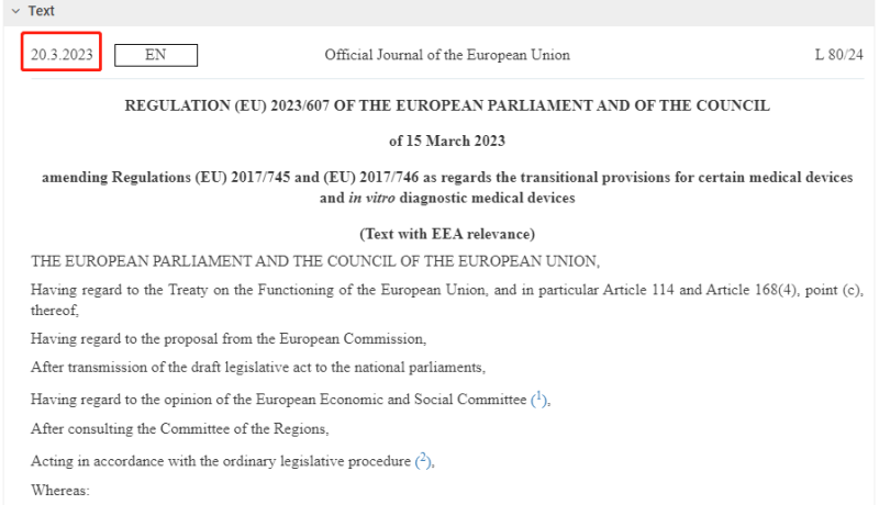 最后,該法案于 2023 年 3 月 15 日由聯(lián)合立法者簽署,并于2023年3月20日在官方公報(OJEU)上公布。自此,有關(guān)MDR過渡期的法案正式“生效”。