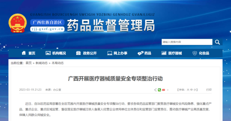 據(jù)廣西壯族自治區(qū)藥監(jiān)局官網(wǎng)消息,近日,該局部署在全區(qū)范圍內(nèi)開展醫(yī)療器械質(zhì)量安全專項(xiàng)整治行動(dòng),要求各級(jí)藥品監(jiān)管部門聚焦醫(yī)療器械安全風(fēng)險(xiǎn)隱患、強(qiáng)化重點(diǎn)產(chǎn)品、重點(diǎn)企業(yè)、重點(diǎn)區(qū)域監(jiān)管,督促落實(shí)醫(yī)療器械注冊(cè)人備案人經(jīng)營(yíng)企業(yè)使用單位主體責(zé)任和監(jiān)管部門監(jiān)管責(zé)任,推動(dòng)醫(yī)療器械產(chǎn)業(yè)高質(zhì)量發(fā)展,保障人民群眾用械安全。