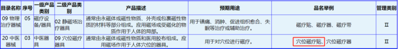 穴位磁療貼屬于磁療產(chǎn)品這個大類,它是指利用磁場的物理性能治療或緩解人體疾病的醫(yī)療器械。雖然磁療也是物理治療方式的一種,但因為本期取證產(chǎn)品名稱有一個前綴“穴位”,便被劃分到了“中醫(yī)器械”范疇,分類編碼20-03-09(未被應用在穴位的磁療貼分類編碼則為09-05-02)。
