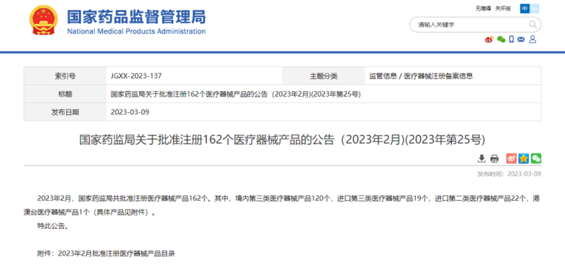 據(jù)國(guó)家藥監(jiān)局官網(wǎng)最新公告,2023年2月,國(guó)家藥監(jiān)局共批準(zhǔn)注冊(cè)醫(yī)療器械產(chǎn)品162個(gè)。其中,境內(nèi)第三類醫(yī)療器械產(chǎn)品120個(gè),進(jìn)口第三類醫(yī)療器械產(chǎn)品19個(gè),進(jìn)口第二類醫(yī)療器械產(chǎn)品22個(gè),港澳臺(tái)醫(yī)療器械產(chǎn)品1個(gè)(具體產(chǎn)品見(jiàn)附件)。