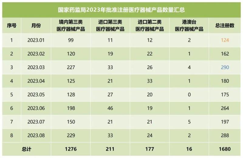 我們同步匯總了2023年各個(gè)月份國(guó)家藥監(jiān)局批準(zhǔn)注冊(cè)的醫(yī)療器械產(chǎn)品數(shù)量(見(jiàn)下方表格),從表格中可以看出,截至8月,2023年國(guó)家藥監(jiān)局總計(jì)批準(zhǔn)注冊(cè)醫(yī)療器械產(chǎn)品1680個(gè),其中境內(nèi)第三類醫(yī)療器械產(chǎn)品1276個(gè),進(jìn)口第三類醫(yī)療器械產(chǎn)品211個(gè)(第三類醫(yī)療器械產(chǎn)品總計(jì)1487個(gè)),進(jìn)口第二類醫(yī)療器械產(chǎn)品177個(gè),港澳臺(tái)醫(yī)療器械產(chǎn)品16個(gè)。