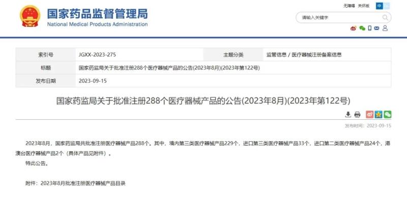 據(jù)國(guó)家藥監(jiān)局官網(wǎng)近日發(fā)布,2023年8月,國(guó)家藥監(jiān)局共批準(zhǔn)注冊(cè)醫(yī)療器械產(chǎn)品288個(gè)。其中,境內(nèi)第三類醫(yī)療器械產(chǎn)品229個(gè),進(jìn)口第三類醫(yī)療器械產(chǎn)品33個(gè),進(jìn)口第二類醫(yī)療器械產(chǎn)品24個(gè),港澳臺(tái)醫(yī)療器械產(chǎn)品2個(gè)。