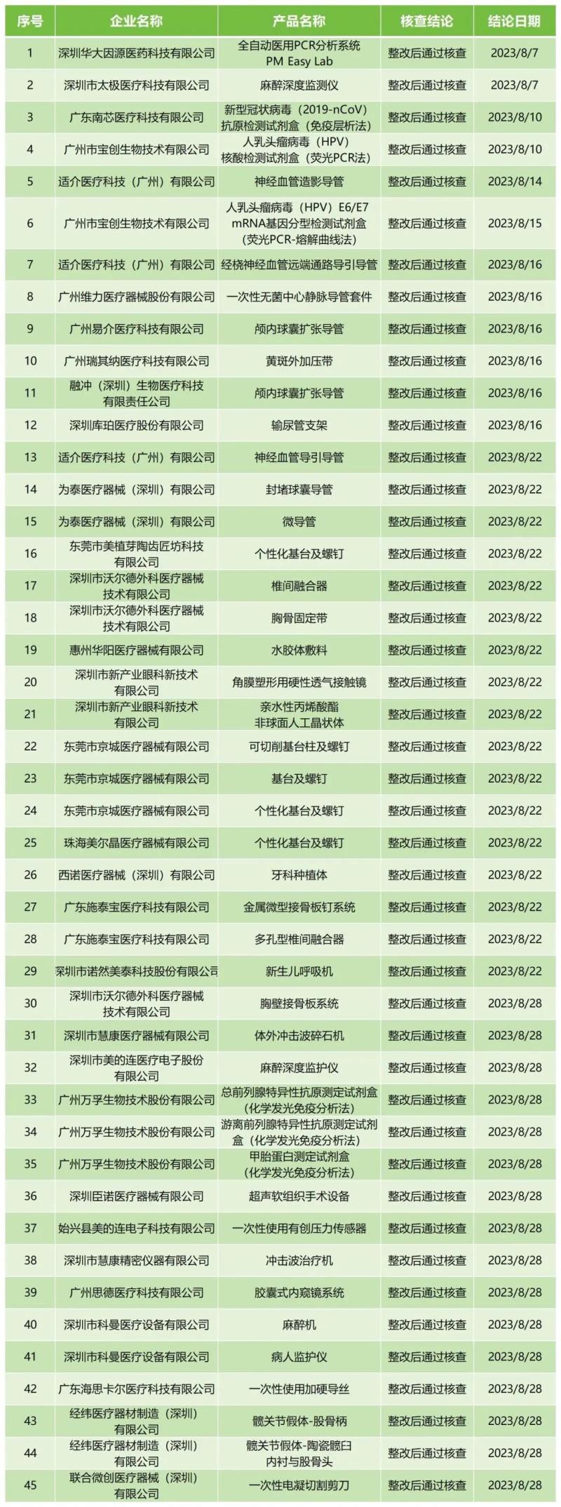 9月18日,廣東省藥監(jiān)局官網(wǎng)公布2023年8月醫(yī)療器械注冊(cè)質(zhì)量管理體系核查結(jié)果,包括深圳市沃爾德外科醫(yī)療器械技術(shù)有限公司、廣州萬(wàn)孚生物技術(shù)股份有限公司、深圳市科曼醫(yī)療設(shè)備有限公司在內(nèi)的32家公司共計(jì)45款產(chǎn)品,均為“整改后通過(guò)核查”。具體明細(xì)見(jiàn)下方表格: