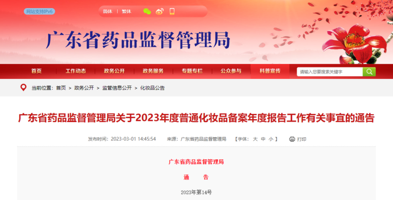 3月1日,廣東省藥監(jiān)局官網(wǎng)發(fā)布《關(guān)于2023年度普通化妝品備案年度報(bào)告工作有關(guān)事宜的通告》,其中指出,自2022年1月1日起,普通化妝品備案人應(yīng)當(dāng)于每年1月1日至3月31日期間,通過(guò)新注冊(cè)備案平臺(tái),提交備案時(shí)間滿一年普通化妝品的年度報(bào)告。2023年度備案年度報(bào)告工作已于2023年1月1日開(kāi)始,將于2023年3月31日結(jié)束。2021年12月31日前備案的產(chǎn)品應(yīng)當(dāng)開(kāi)展2023年度備案年度報(bào)告工作。