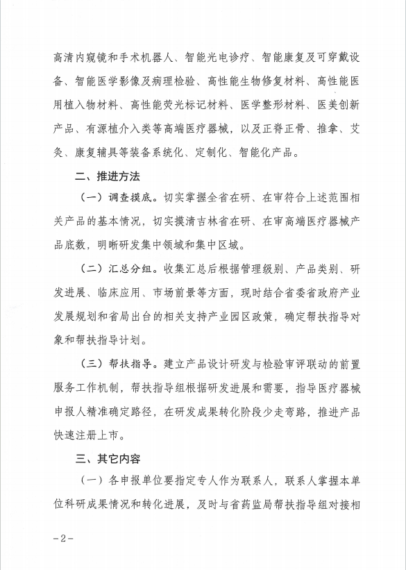 其中提到,產(chǎn)品范圍包括“吉林省在研、在審的第二類和第三類高端醫(yī)療器械產(chǎn)品,特別是智能分子診斷、生化與免疫臨床檢驗、即時檢驗檢測、智能高清內(nèi)窺鏡和手術(shù)機(jī)器人、智能光電診療、智能康復(fù)及可穿戴設(shè)備、智能醫(yī)學(xué)影像及病理檢驗、高性能生物修復(fù)材料、高性能醫(yī)用植入物材料、高性能熒光標(biāo)記材料、醫(yī)學(xué)整形材料、醫(yī)美創(chuàng)新產(chǎn)品、有源植介入類等高端醫(yī)療器械,以及正脊正骨、推拿、艾灸、康復(fù)輔具等裝備系統(tǒng)化、定制化、智能化產(chǎn)品。”