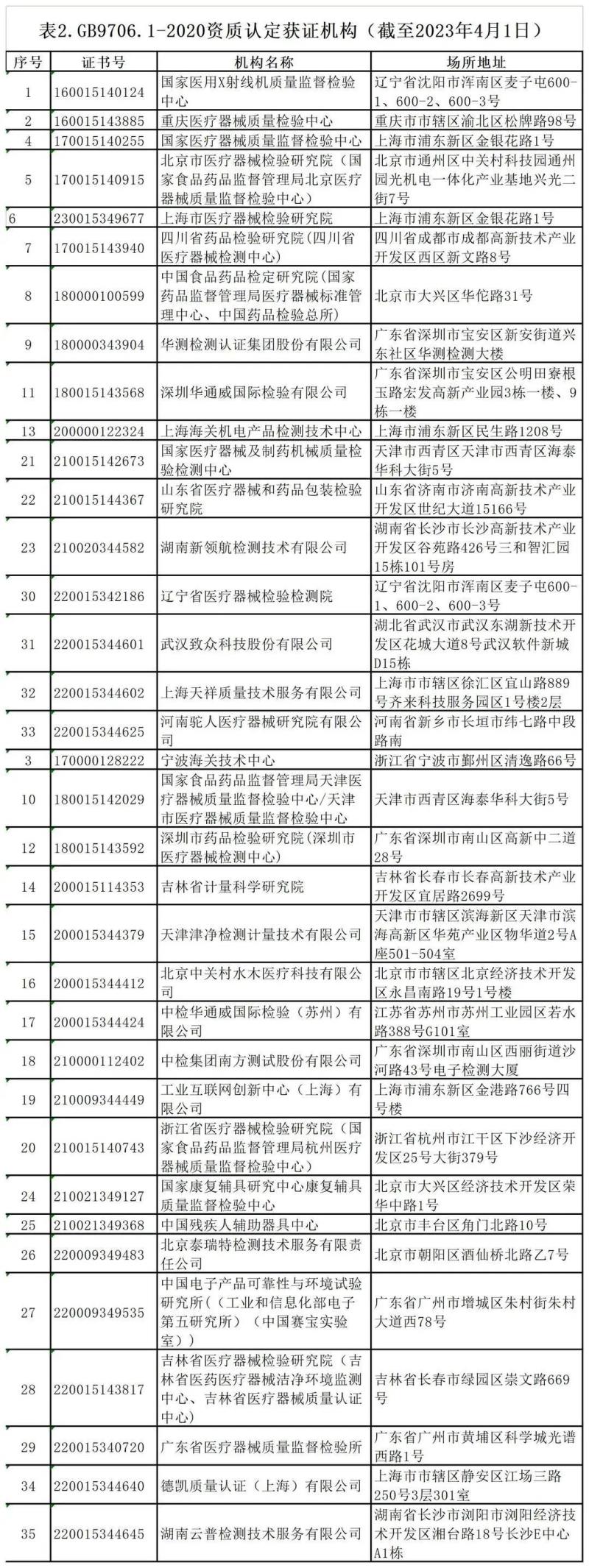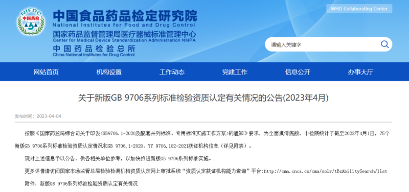 近日,中檢院官網(wǎng)發(fā)布《關(guān)于新版GB 9706系列標準檢驗資質(zhì)認定有關(guān)情況的公告(2023年4月)》(以下簡稱《公告》),公布了截至2023年4月1日,75個新版GB 9706系列標準檢驗資質(zhì)認定情況和GB 9706.1-2020、YY 9706.102-2021獲證機構(gòu)信息(詳見文末附件),其中GB 9706.1-2020資質(zhì)認定獲證機構(gòu)具體如下: