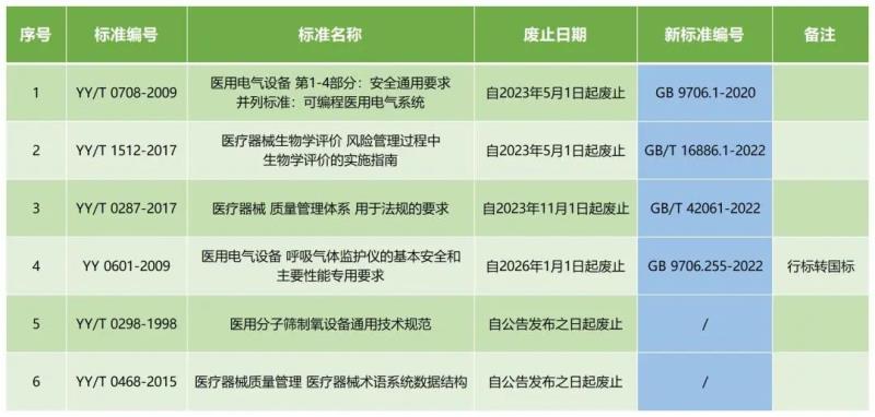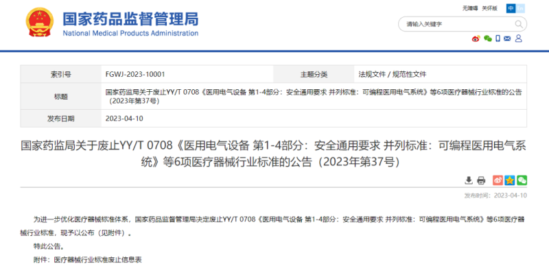 4月10日,國(guó)家藥監(jiān)局官網(wǎng)發(fā)布公告稱,廢止YY/T 0708-2009《醫(yī)用電氣設(shè)備 第1-4部分:安全通用要求 并列標(biāo)準(zhǔn):可編程醫(yī)用電氣系統(tǒng)》、YY/T 0287-2017《醫(yī)療器械 質(zhì)量管理體系 用于法規(guī)的要求》等6項(xiàng)行業(yè)標(biāo)準(zhǔn),在國(guó)家藥監(jiān)局發(fā)布的原有附件基礎(chǔ)上,我們加上了這幾項(xiàng)標(biāo)準(zhǔn)的新版替代標(biāo)準(zhǔn),具體如下: