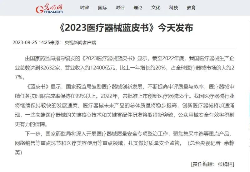近日,由國家藥監(jiān)局指導(dǎo)編發(fā)的《2023 醫(yī)療器械藍皮書》顯示,截至 2022 年底,我國醫(yī)療器械生產(chǎn)企業(yè)總數(shù)達到 32632 家,營業(yè)收入約 12400 億元,比上一年增長約 20%,占全球醫(yī)療器械市場的大約 27%。
