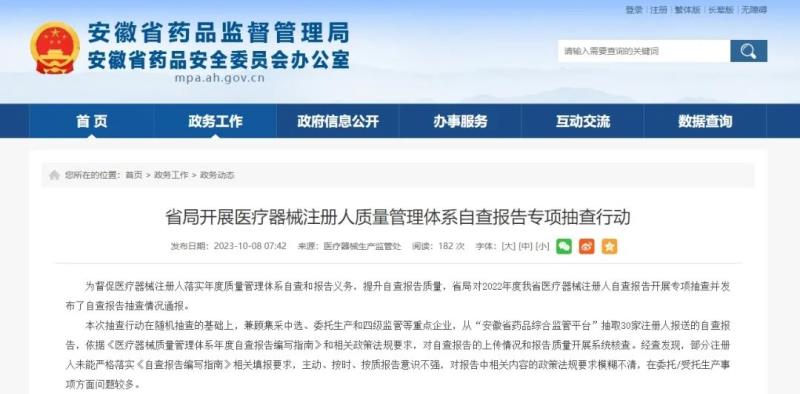 該局指出,本次抽查行動(dòng)在隨機(jī)抽查的基礎(chǔ)上,兼顧集采中選、委托生產(chǎn)和四級(jí)監(jiān)管等重點(diǎn)企業(yè),從“安徽省藥品綜合監(jiān)管平臺(tái)”抽取30家注冊(cè)人報(bào)送的自查報(bào)告,依據(jù)《醫(yī)療器械質(zhì)量管理體系年度自查報(bào)告編寫指南》(以下簡(jiǎn)稱《編寫指南》)和相關(guān)政策法規(guī)要求,對(duì)自查報(bào)告的上傳情況和報(bào)告質(zhì)量開展系統(tǒng)核查。經(jīng)查發(fā)現(xiàn),部分注冊(cè)人未能嚴(yán)格落實(shí)《編寫指南》相關(guān)填報(bào)要求,主動(dòng)、按時(shí)、按質(zhì)報(bào)告意識(shí)不強(qiáng),對(duì)報(bào)告中相關(guān)內(nèi)容的政策法規(guī)要求模糊不清,在委托/受托生產(chǎn)事項(xiàng)方面問(wèn)題較多。