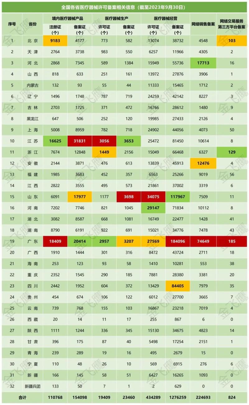 10月18日,國家藥監(jiān)局公布了截至2023年9月30日各省有效期內(nèi)醫(yī)療器械產(chǎn)品注冊備案、醫(yī)療器械生產(chǎn)企業(yè)許可備案等信息,老規(guī)矩,金飛鷹小編對此稍作編輯,標(biāo)注紅色、綠色、黃色的分別為前三甲。