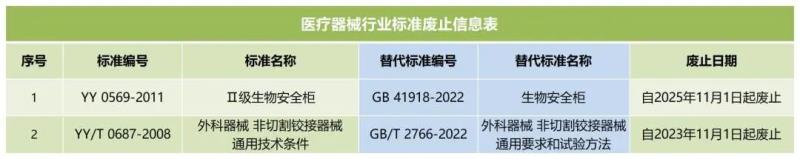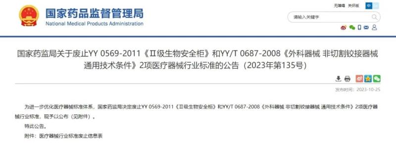 10月25日,國(guó)家藥監(jiān)局官網(wǎng)發(fā)布公告稱,廢止YY 0569-2011《Ⅱ級(jí)生物安全柜》和YY/T 0687-2008《外科器械 非切割鉸接器械 通用技術(shù)條件》2項(xiàng)醫(yī)療器械行業(yè)標(biāo)準(zhǔn),除附件中公布的廢止日期外,我們同步整理了此兩項(xiàng)標(biāo)準(zhǔn)廢止后的替代標(biāo)準(zhǔn),具體如下:
