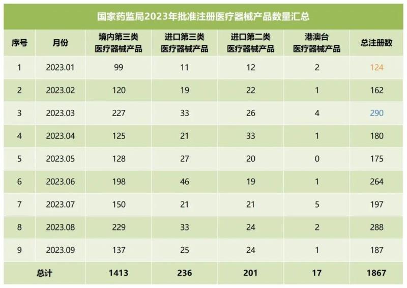 我們同步匯總了2023年各個月份國家藥監(jiān)局批準注冊的醫(yī)療器械產品數量(見下方表格),從表格中可以看出,截至9月,2023年國家藥監(jiān)局總計批準注冊醫(yī)療器械產品1867個,其中境內第三類醫(yī)療器械產品1413個,進口第三類醫(yī)療器械產品236個(第三類醫(yī)療器械產品總計1649個),進口第二類醫(yī)療器械產品201個,港澳臺醫(yī)療器械產品17個。