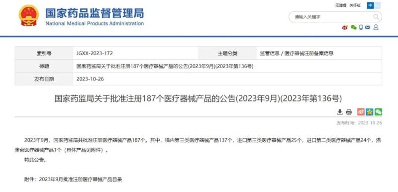 10月26日,國家藥監(jiān)局官網發(fā)布公告稱,2023年9月,國家藥監(jiān)局共批準注冊醫(yī)療器械產品187個。其中,境內第三類醫(yī)療器械產品137個,進口第三類醫(yī)療器械產品25個,進口第二類醫(yī)療器械產品24個,港澳臺醫(yī)療器械產品1個。