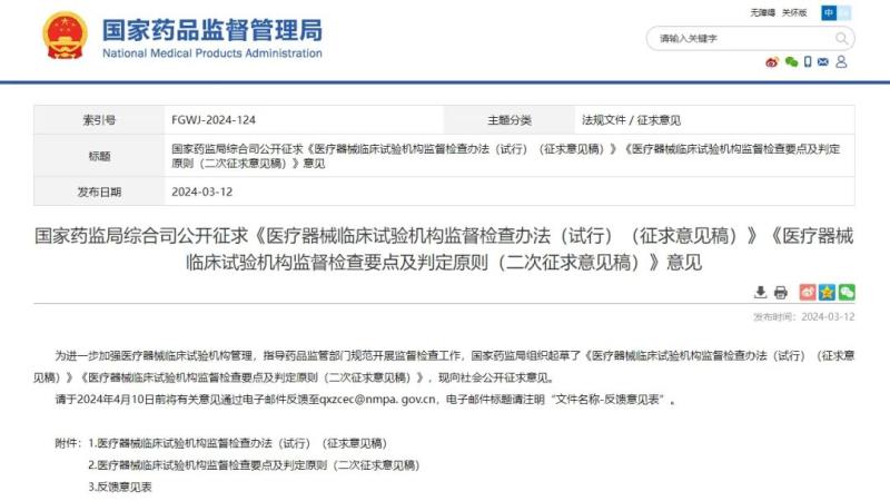 3月12日,國家藥監(jiān)局發(fā)布《醫(yī)療器械臨床試驗(yàn)機(jī)構(gòu)監(jiān)督檢查辦法(試行)(征求意見稿)》《醫(yī)療器械臨床試驗(yàn)機(jī)構(gòu)監(jiān)督檢查要點(diǎn)及判定原則(二次征求意見稿)》,并向社會公開征求意見。