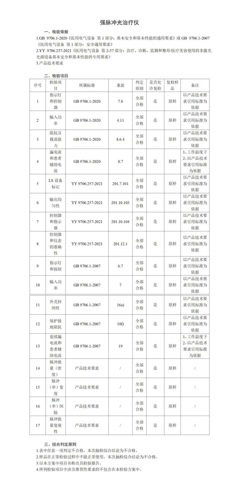 其中針對強脈沖光治療儀,國家藥監(jiān)局共提出了漏電流和患者輔助電流、LS設(shè)備標記、輸出均勻性、脈沖(串)寬度、脈沖(串)間隔等17個檢驗項目,同時指出,任意一項判定不合格,抽檢綜合結(jié)論即為不合格。具體如下: