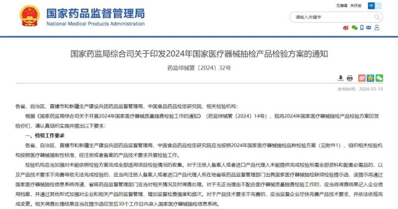 3月19日,國家藥監(jiān)局官網(wǎng)發(fā)布《2024年國家醫(yī)療器械抽檢產(chǎn)品檢驗方案》,強脈沖光治療儀、醫(yī)用脈搏血氧儀、醫(yī)用分子篩制氧機、超聲治療設(shè)備、水膠體敷料等66個品種被納入抽檢品種名單。