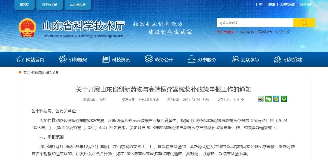 近日,山東省科學(xué)技術(shù)廳發(fā)布通知稱,根據(jù)《山東省創(chuàng)新藥物與高端醫(yī)療器械引領(lǐng)行動(dòng)計(jì)劃(2023-2025年)》(魯科創(chuàng)委辦發(fā)〔2022〕3號(hào))相關(guān)要求,決定開展2023年度創(chuàng)新藥物與高端醫(yī)療器械獎(jiǎng)補(bǔ)政策申報(bào)工作,有關(guān)事項(xiàng)具體如下: