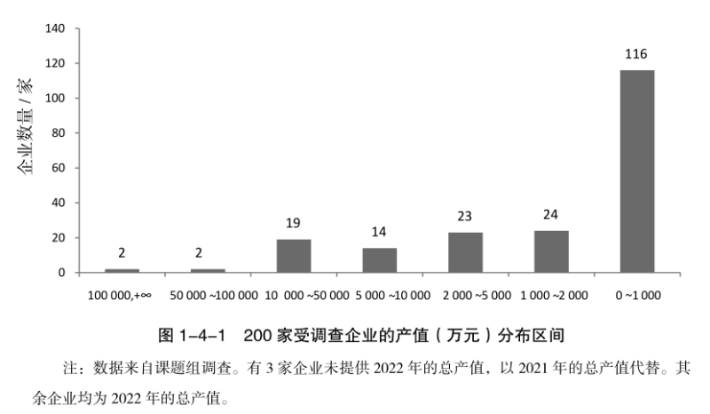 調(diào)查結(jié)果顯示,2022年,200家受調(diào)查注冊(cè)企業(yè)的總產(chǎn)值加總約為129.4億元(個(gè)別企業(yè)尚未公布2022年的總產(chǎn)值,以2021年的總產(chǎn)值代替),員工人數(shù)總計(jì)20029人,平均每家企業(yè)產(chǎn)值約為6460萬(wàn)元,平均雇傭的員工人數(shù)為100人,人均產(chǎn)值約為64.6萬(wàn)元。