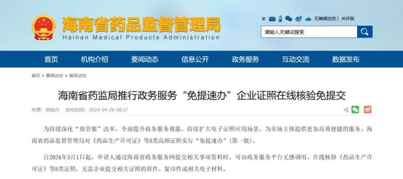 自2024年3月1日起,申請人通過海南省政務(wù)服務(wù)網(wǎng)提交相關(guān)事項資料時,可由政務(wù)服務(wù)平臺無感調(diào)用、在線核驗《藥品生產(chǎn)許可證》等8類證照,無需企業(yè)提交相關(guān)證照的原件、復(fù)印件或相關(guān)電子材料。