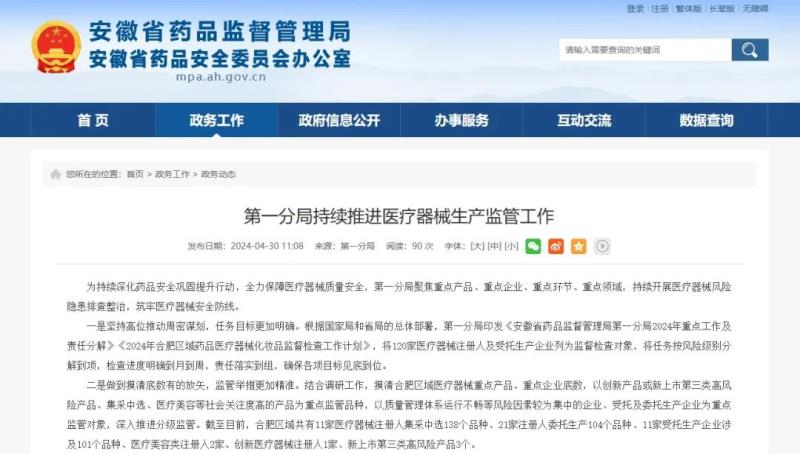 近日,安徽省藥監(jiān)局發(fā)布公告稱,為持續(xù)深化藥品安全鞏固提升行動,全力保障醫(yī)療器械質量安全,安徽藥監(jiān)局第一分局聚焦重點產品、重點企業(yè)、重點環(huán)節(jié)、重點領域,持續(xù)開展醫(yī)療器械風險隱患排查整治,筑牢醫(yī)療器械安全防線。