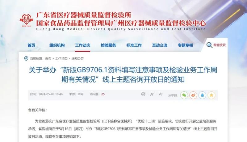 近日,廣東省醫(yī)療器械質(zhì)量監(jiān)督檢驗所官網(wǎng)發(fā)布通知,定于5月16日(周四)舉辦“新版GB 9706.1資料填寫注意事項及檢驗業(yè)務工作周期有關情況”線上主題咨詢開放日活動,具體時間及參會方式如下: