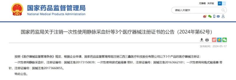 近日,國(guó)家藥監(jiān)局發(fā)布一則醫(yī)療器械注冊(cè)證注銷公告,公告顯示,該局已依法注銷江西三鑫醫(yī)療科技股份有限公司3個(gè)產(chǎn)品的醫(yī)療器械注冊(cè)證,具體如下: