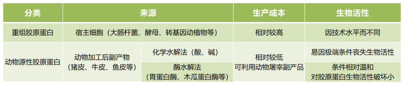 按照來源的不同膠原蛋白可分為重組膠原蛋白和動物源性膠原蛋白。重組膠原蛋白為非天然膠原蛋白,由基因工程技術(shù)合成,而動物源性膠原蛋白則從動物組織中提取。動物源性膠原蛋白生產(chǎn)成本較低且生產(chǎn)工藝相對簡單。而重組膠原蛋白擁有更高的生物活性與生物相容性、更低的免疫原性、更低的漏檢病原體隱患風(fēng)險、更好的水溶性、無細(xì)胞毒性以及可進(jìn)一步加工優(yōu)化等特點,因此其應(yīng)用范圍更加廣泛,受到市場的強(qiáng)烈關(guān)注。
