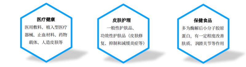 膠原蛋白因為在工業(yè)上有廣泛的應(yīng)用,被認(rèn)為是用途最廣泛的生物材料之一。由于其高蛋白質(zhì)含量以及諸如吸水性、凝膠形成性和乳化穩(wěn)定性的功能性屬性,在食品工業(yè)中對膠原蛋白有著巨大的需求。在生物醫(yī)學(xué)和制藥領(lǐng)域,膠原蛋白有著多種應(yīng)用,被用作藥物、蛋白質(zhì)和基因的載體,同時也可作為人造人類皮膚、血管和韌帶的替代品。