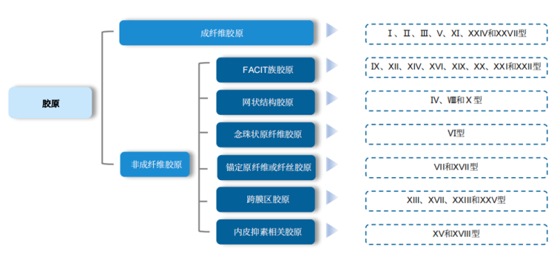 目前已鑒別出大約29種不同的膠原蛋白型別,所有的膠原纖維至少都具有一種三股螺旋結(jié)構(gòu)。它們之間的區(qū)別在于成分、功能以及在體內(nèi)的位置。