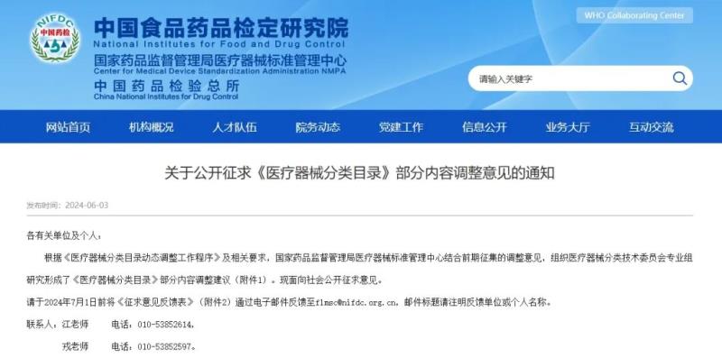 6月3日,國家藥監(jiān)局醫(yī)療器械標(biāo)管中心發(fā)布《關(guān)于公開征求〈醫(yī)療器械分類目錄〉部分內(nèi)容調(diào)整意見的通知》,并向社會(huì)公開征求意見。