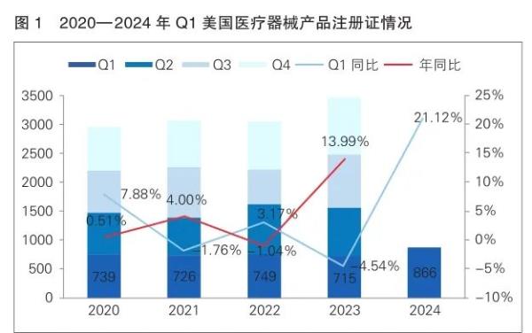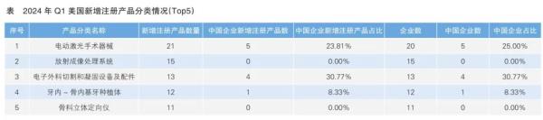 從整體注冊情況來看,2024年一季度,中國企業(yè)在美國獲批醫(yī)療器械產(chǎn)品中,“經(jīng)皮神經(jīng)電刺激儀(用于非處方用途)”的產(chǎn)品數(shù)量最多;其次是“電動激光手術(shù)器械”,產(chǎn)品數(shù)量為5件,占該分類新注冊產(chǎn)品總數(shù)的23.81%,涉及中國企業(yè)5家,占該分類注冊企業(yè)總數(shù)的25.00%。