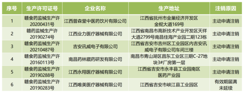 近日,江西省藥監(jiān)局發(fā)布公告稱,由于企業(yè)主動(dòng)申請(qǐng)或有效期屆滿未延續(xù),該局已依法注銷了江西普森堂中醫(yī)藥飲片有限公司、江西業(yè)力醫(yī)療器械有限公司等6家企業(yè)的《醫(yī)療器械生產(chǎn)許可證》。具體明細(xì)如下: