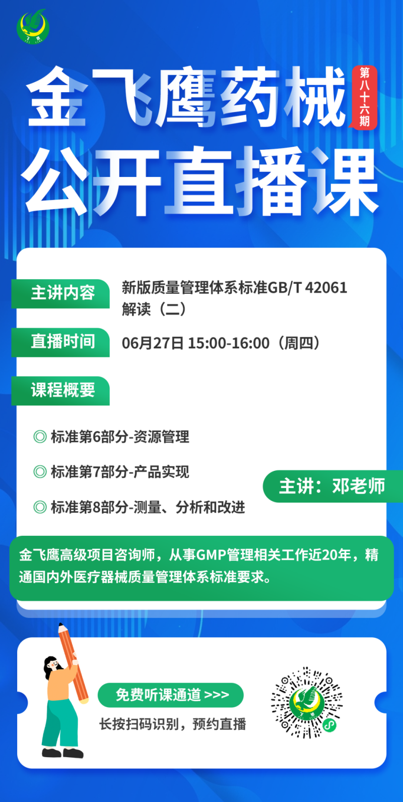 6月27日下午3點,金飛鷹高級項目咨詢師,從事GMP管理相關(guān)工作近20年,精通國內(nèi)外醫(yī)療器械質(zhì)量管理體系標(biāo)準(zhǔn)要求的鄧?yán)蠋?/span>,給大家?guī)怼缎掳驷t(yī)療器械質(zhì)量管理體系標(biāo)準(zhǔn)GB/T 42061解讀(二)》,培訓(xùn)內(nèi)容是標(biāo)準(zhǔn)的第6-8部分(資源管理、產(chǎn)品實現(xiàn)、測量/分析和改進)解讀,大家千萬不要錯過了哦!