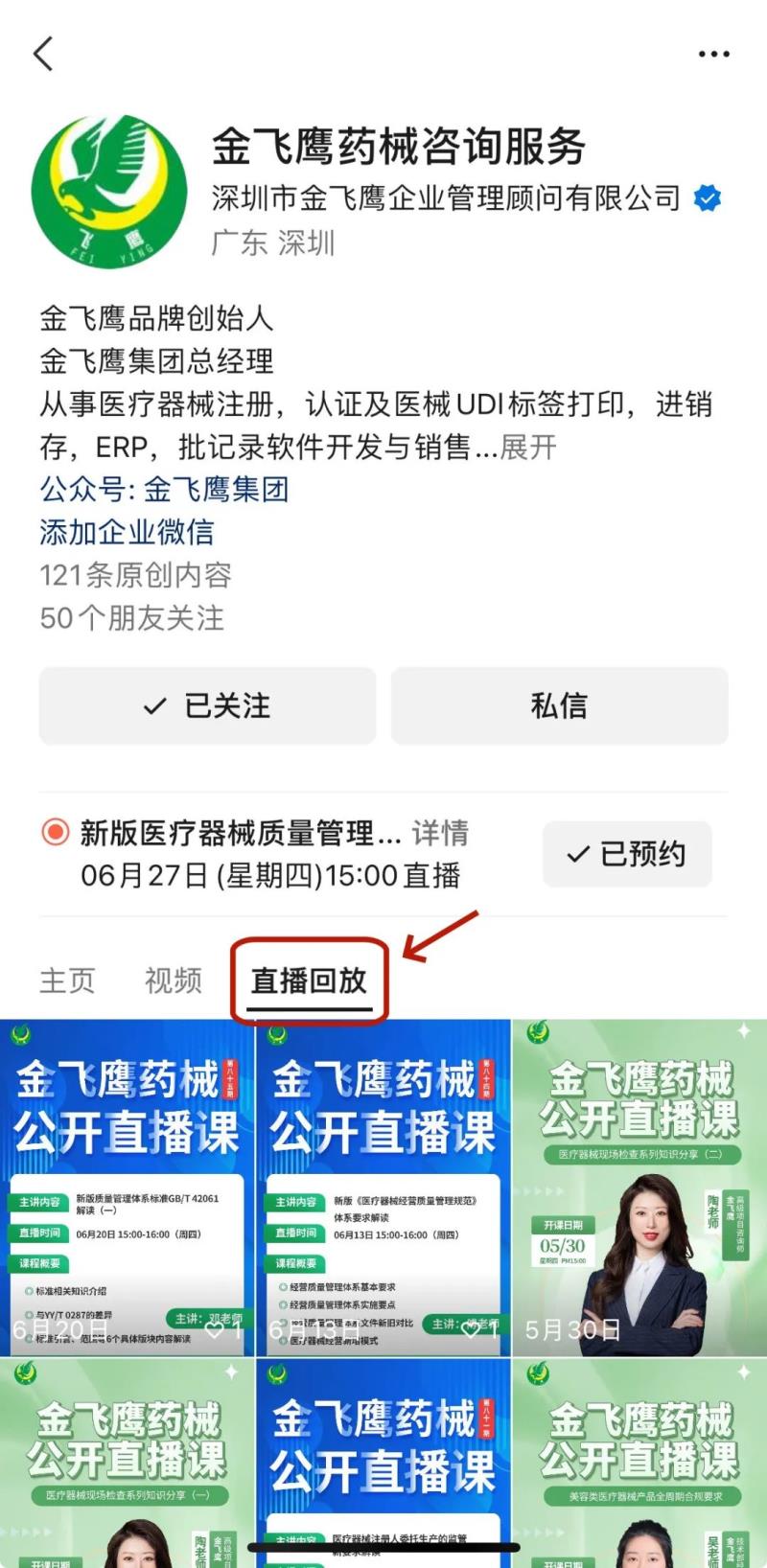 往期直播培訓(xùn)課程支持回放,關(guān)注“金飛鷹藥械咨詢服務(wù)”視頻號并點擊視頻號主頁,即可查看“直播回放”哦~
