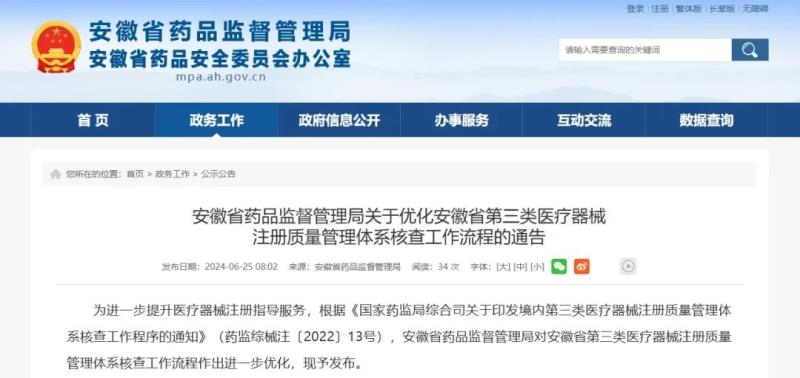 6月25日,安徽省藥監(jiān)局發(fā)布通告稱,根據(jù)《國家藥監(jiān)局綜合司關于印發(fā)境內第三類醫(yī)療器械注冊質量管理體系核查工作程序的通知》(藥監(jiān)綜械注〔2022〕13號),該局對安徽省第三類醫(yī)療器械注冊質量管理體系核查工作流程作出進一步優(yōu)化。