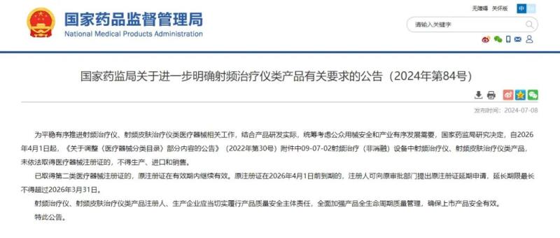 為平穩(wěn)有序推進射頻治療儀、射頻皮膚治療儀類醫(yī)療器械相關工作,結合產品研發(fā)實際,統(tǒng)籌考慮公眾用械安全和產業(yè)有序發(fā)展需要,國家藥監(jiān)局研究決定,自2026年4月1日起,《關于調整〈醫(yī)療器械分類目錄〉部分內容的公告》(2022年第30號)附件中09-07-02射頻治療(非消融)設備中射頻治療儀、射頻皮膚治療儀類產品,未依法取得醫(yī)療器械注冊證的,不得生產、進口和銷售。