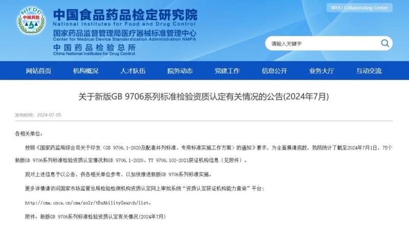 近日,中檢院官網(wǎng)公布了截至2024年7月1日,75個新版GB 9706系列標(biāo)準(zhǔn)檢驗(yàn)資質(zhì)認(rèn)定情況和GB 9706.1-2020、YY 9706.102-2021獲證機(jī)構(gòu)信息。