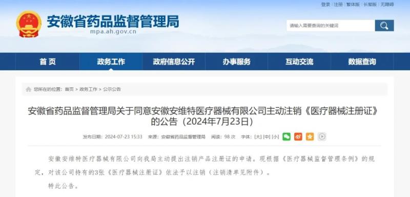 7月23日,安徽省藥監(jiān)局發(fā)布公告稱,安徽安維特醫(yī)療器械有限公司向該局主動提出注銷產品注冊證的申請。根據《醫(yī)療器械監(jiān)督管理條例》的規(guī)定,安徽省藥監(jiān)局對這家公司持有的3張《醫(yī)療器械注冊證》依法予以注銷,注銷清單具體如下: