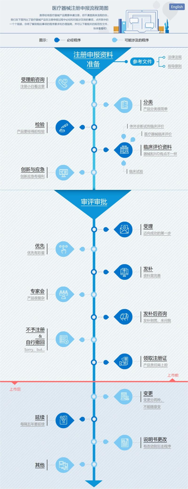 眾所周知,醫(yī)療器械注冊申報是一項較為繁瑣的工作,需要經(jīng)歷產(chǎn)品送檢、注冊資料編寫&提交、審評發(fā)補(bǔ)等諸多環(huán)節(jié),且每一環(huán)節(jié)都有相應(yīng)注意事項,本期文章我們就轉(zhuǎn)載了國家藥監(jiān)局器審中心公開的《醫(yī)療器械注冊申報流程簡圖》,以供大家參考~